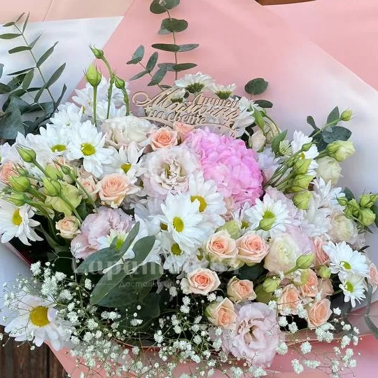 ГлавнаяКаталогБукетыБукет с розовой гориензией и нежными цветами в белых, кремовых оттенках
